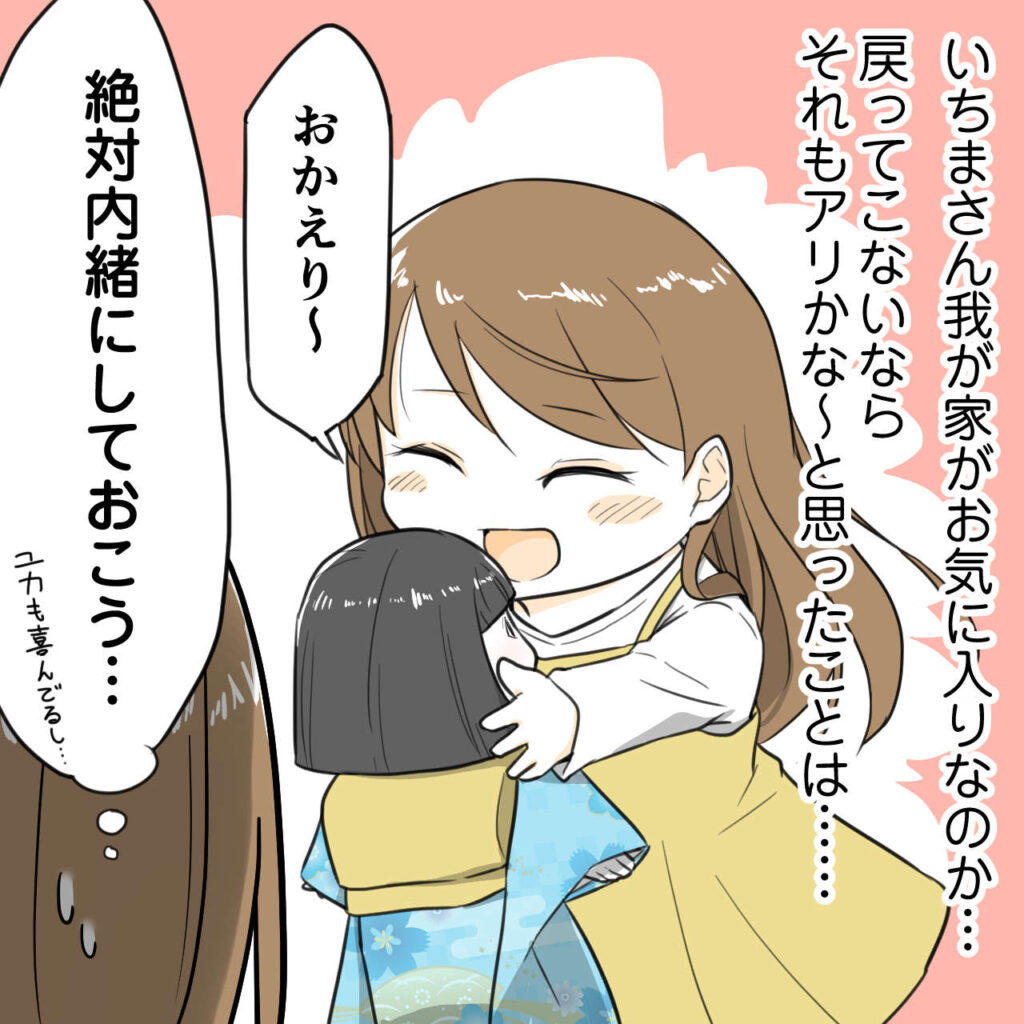 「いちまさんは、我が家がお気に入りなのか・・戻ってこないなら、それもアリかとは思ったけれど、絶対内緒にしておこう」と密かに決めました。ユカは「おかえり~」そう言っていちまさんを抱きしめました。