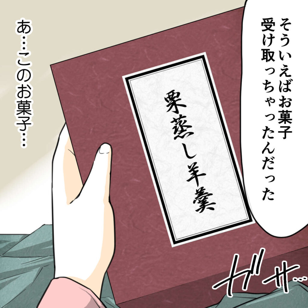 そして、「そういえばお菓子受け取っちゃったんだった」そう思い、紙袋から出してみると栗蒸し羊羹が!「あ・・このお菓子」私には思い出があるお菓子です。