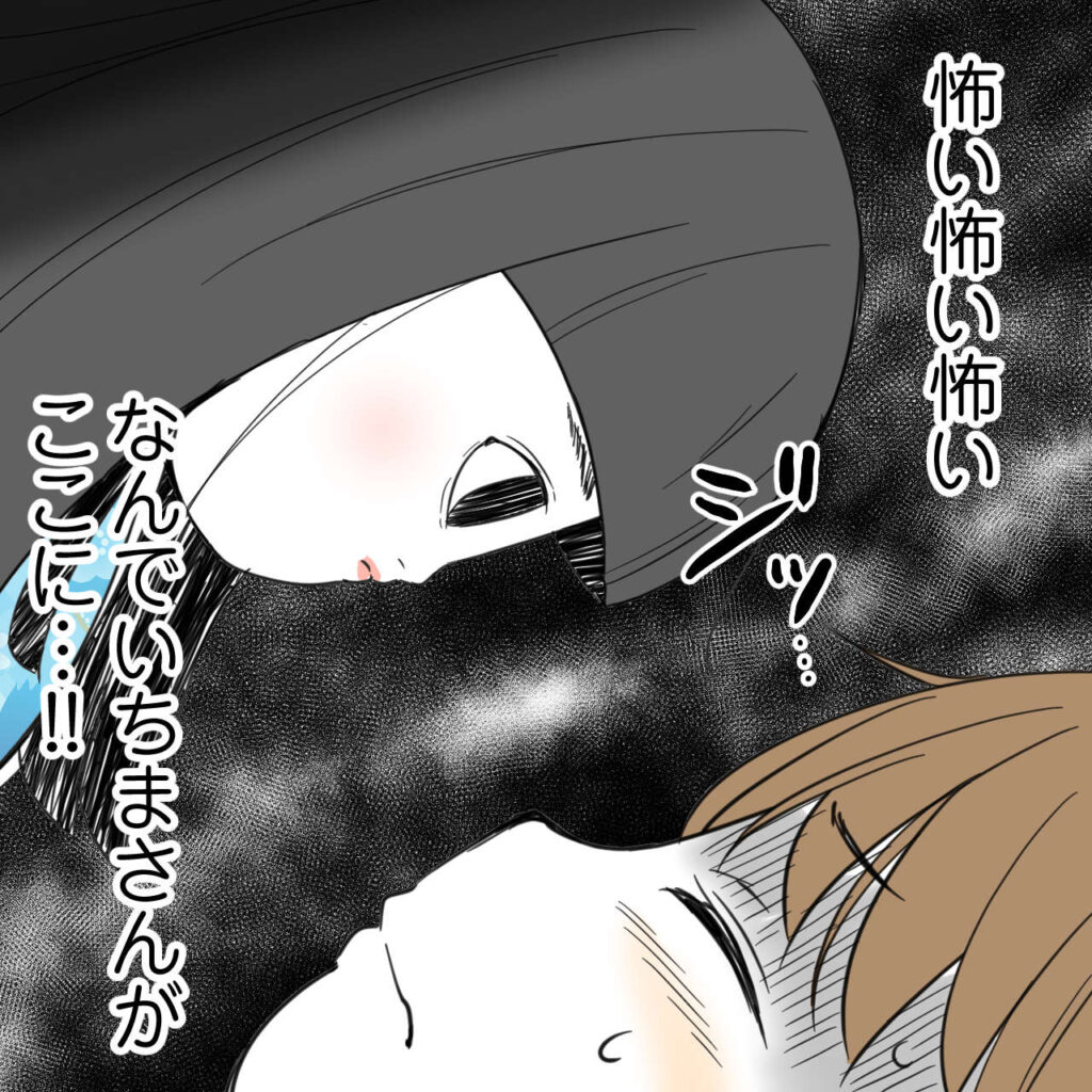 「怖い怖い怖い・・!なんでいちまさんがここに・・!!」と思いながら、怖くて目を閉じていた私。それでも、いちまさんがじっと見つめているのがわかりました。