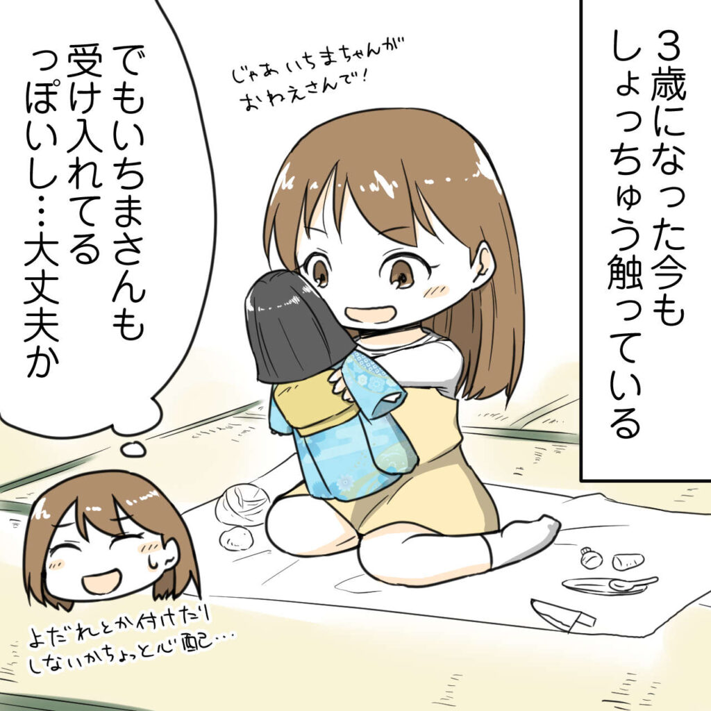 高校生になった私。彼氏を家に連れてきた時、いちまさんを否定したことが原因なのか・・二股をかけていたことが判明して別れることに。おまけに自転車で転んで骨折までしたらしい。対する今の夫は、「優しい雰囲気の人形だね~」といちまさんを絶賛し、とんとん拍子で結婚することに。いちまさんが悪縁を払ってくれたのか、自然に疎遠になり感謝していました。
