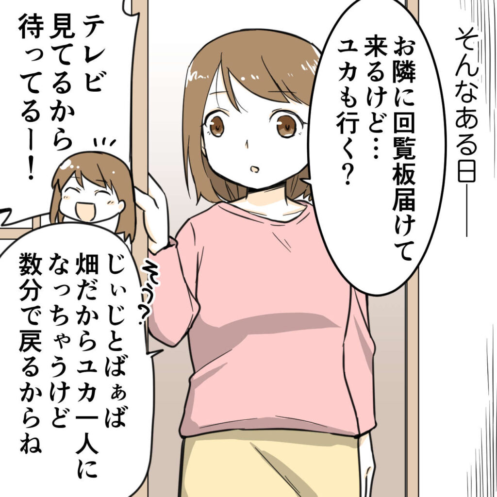 そんなある日・・。「お隣に回覧板届けてくるけど・・ユカも行く?」そうたずねると、「テレビ見てるから待ってるー!」とユカ。「そう?じぃじとばぁば畑だからユカ一人になっちゃうけど、数分で戻るからね」そう言って家を出ました。