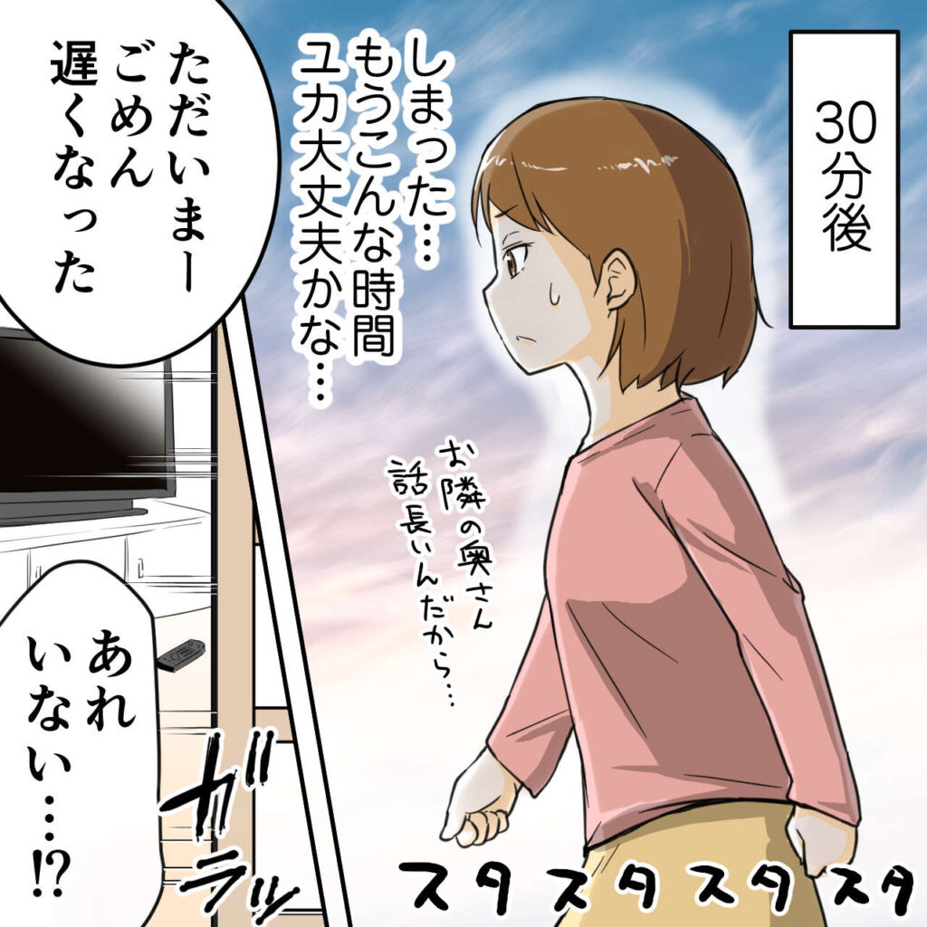 「しまった・・もうこんな時間。ユカ大丈夫かな・・」お隣の奥さんの話につきあい、帰りそびれてしまった私。家に着いて、「ただいまー!ごめん遅くなった」と声をかけるも、「あれいない・・!?」人気がない・・。