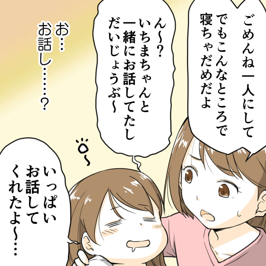 ユカに駆け寄り、「ごめんね。一人にして。でも、こんなところで寝ちゃだめだよ」と言うと、「ん~?いちまちゃんと一緒にお話してたしだいじょうぶ~。いっぱいお話してくれたよ~」と寝ぼけながら答えるユカの言葉に、「お・・お話い・・?」と頭をひねる私。