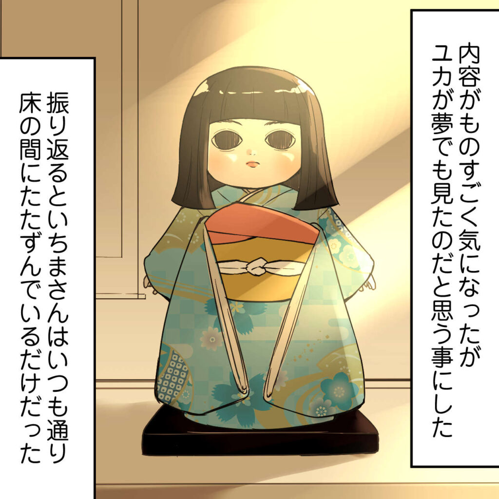 どんな内容だったのか、ものすごく気になったものの、ユカが夢でも見たのだと思う事にしたのでした。そして、振り返ると、いちまさんは、いつも通り床の間にたたずんでいるだけだったのでした。