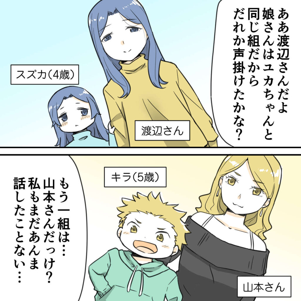 「あぁ、渡辺さんだよ。娘さんはユカちゃんと同じ組だから、だれか声かけたかな?」ミチコの話を聞きながら見つめると、渡辺さんとその娘4歳のスズカちゃん。そしてまた知らない人が。「もう一組は・・山本さんだっけ?私もまだあんま話したことない・・」ミチコの言葉を聞きながら、山本さんと息子5歳のキラくんを見ていました。