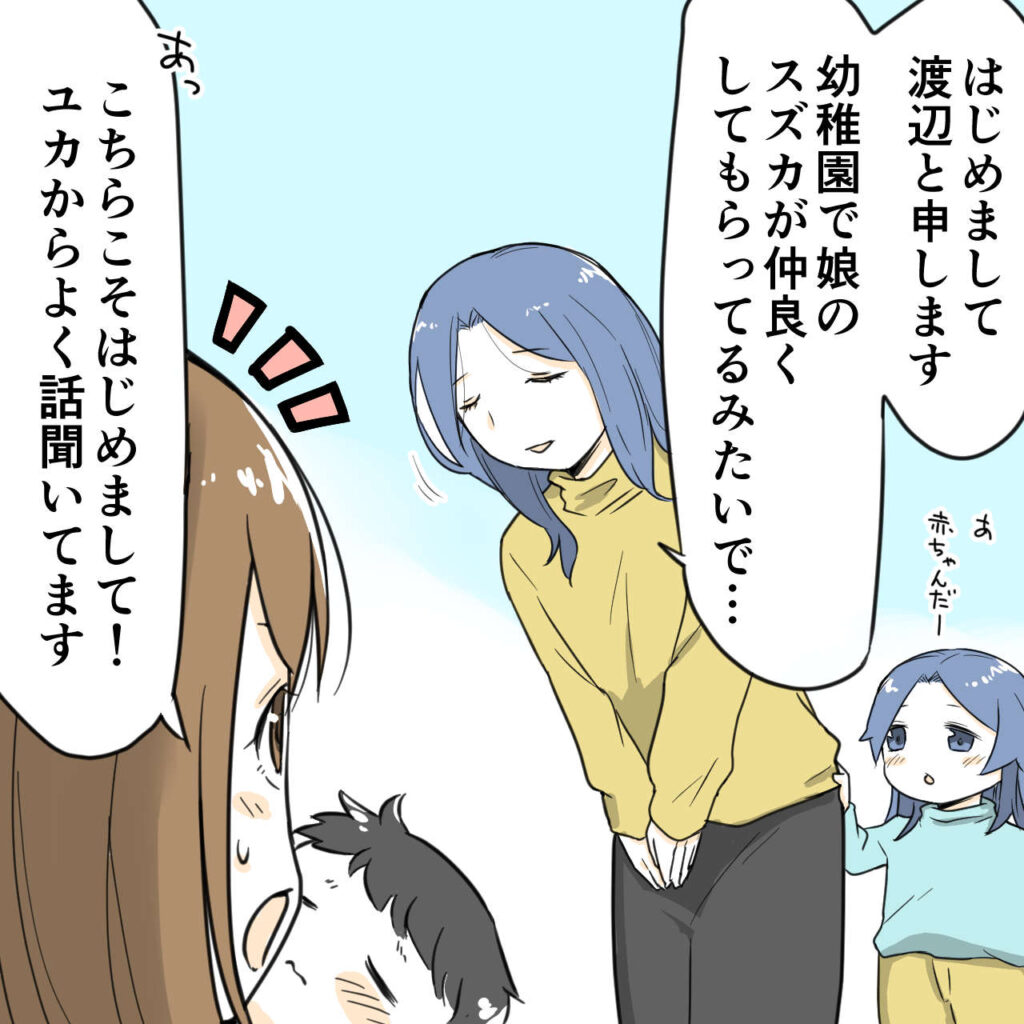 すると、「はじめまして。渡辺と申します。幼稚園で娘のスズカが仲良くしてもらってるみたいで・・」丁寧な挨拶をされ、「あっ、こちらこそはじめまして!ユカからよく話聞いてます」と挨拶しました。