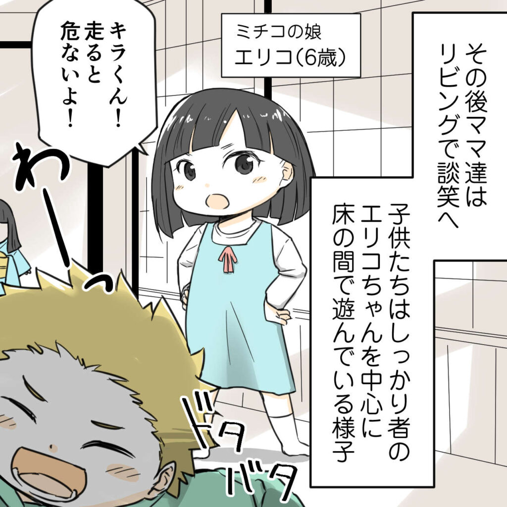 その後、ママ達はリビングで談笑へ。子ども達はしっかり者のエリコちゃんを中心に床の間で遊んでいる様子でした。