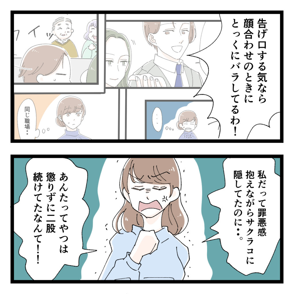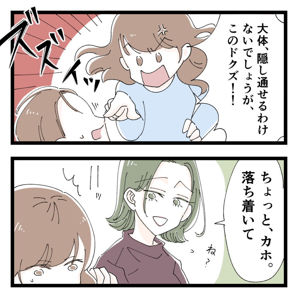 告げ口したと言われ、さらに怒りが増した私は、「告げ口する気なら、顔合わせのときにとっくにバラしてるわ!」と反撃。「私だって、罪悪感抱えながらサクラコに隠してたのに・・。あんたってやつは懲りずに二股続けてたなんて!!」言えば言うほど怒りが!