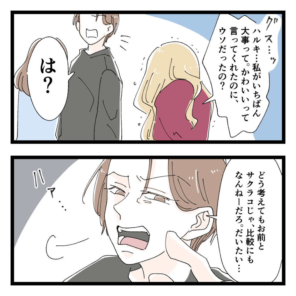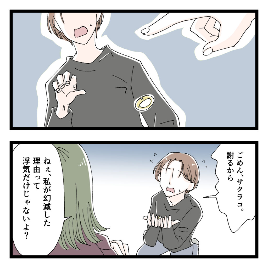ハルキに向かってポイっと投げました。「ごめん、サクラコ。謝るから」ハルキが必死に謝るも、「ねぇ、私が幻滅した理由って浮気だけじゃないよ?」サクラコがハルキに冷たく言い放ちました。
