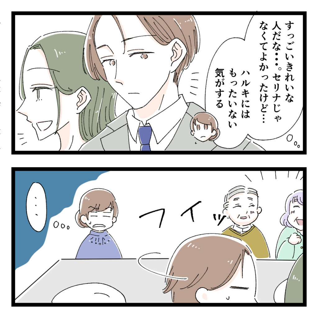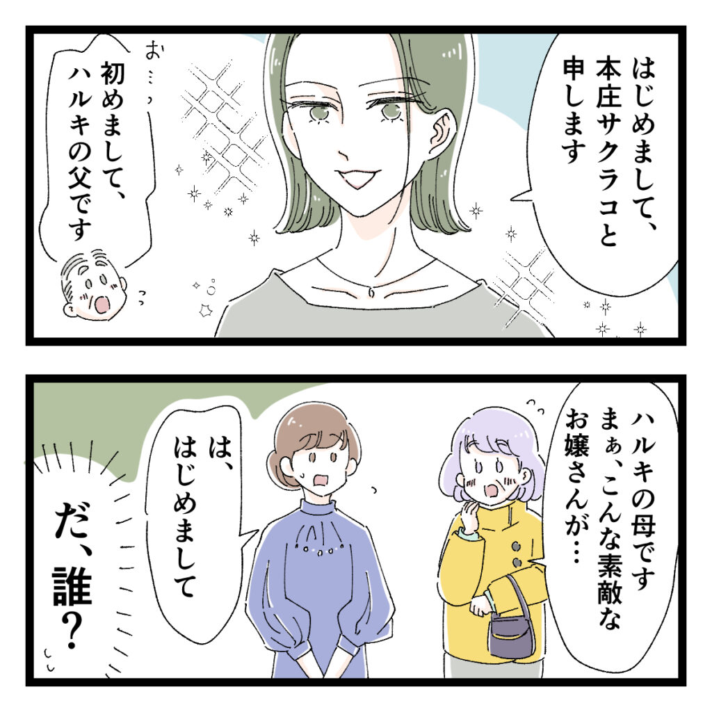 結婚を考えている人がいる、とハルキさんが言い、「あの子は嫌なんだけど・・」とセリナさんのことを良く思っていなかったカホさん。両家顔合わせの当日、高級レストランを予約したハルキさんの前にあらわれたのは、セリナさんではなく本庄サクラコと言う美しい女性。同じ職場の先輩と紹介されたサクラコさんはカホさんと同じ年。「キレイな人だけど、ハルキにはもったいない気がする・・」と思いながらハルキさんをじっと見ていると、視線に気づいたハルキさんがフイッと他所を向き、カホさんは何とも言えない気持ちになりました。