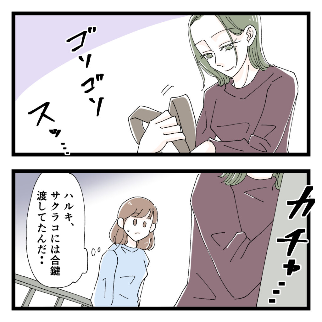 ハルキの部屋の前まで来ると、カバンの中から合鍵を探し、鍵を開けるサクラコ。その姿を見つめながら、「ハルキ、サクラコには合鍵渡してたんだ・・」と、浮気相手との扱いの違いを心の仲で呟く私。だけど爪が甘いよね、ハルキ。合鍵渡しておいて自宅に浮気相手呼ぶなんて信じられない。