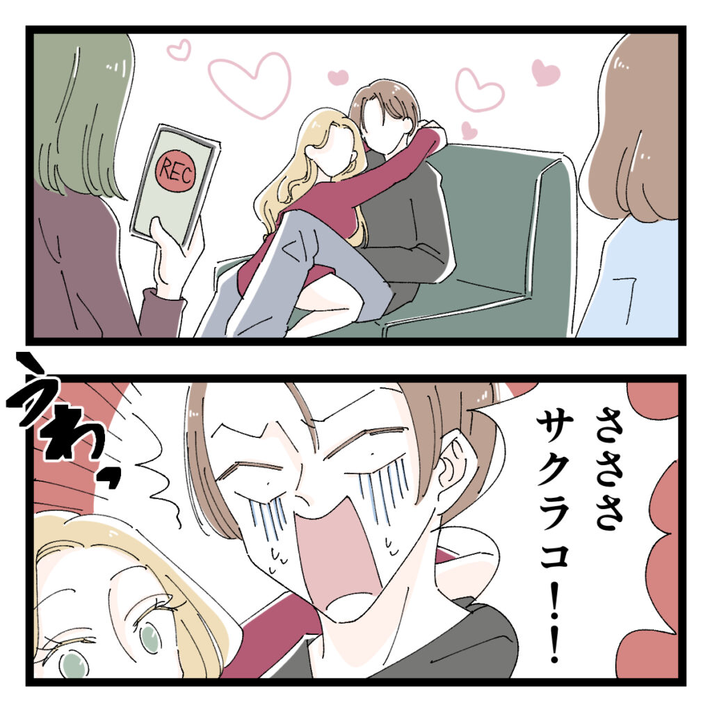 自身の出張中、ハルキさんが絶対に浮気するだろう、と思ったサクラコさんは、予定より1日早く戻り、カホさんと一緒に突撃することに、そしていざ、合鍵で部屋のドアを開け、スマホで動画を撮影しながら部屋の仲に行くと、目の前にはソファの前で抱き合うハルキさんとセリナさん!サクラコさんの登場に動揺するハルキさんに、「あんたってやつは・・」と呆れるカホさんに、「なんか用ですかぁ??」とセリナさんが言うと、慌てて突き飛ばたハルキさんが、「これは違うんだ!!」と慌ててサクラコさんに駆け寄りました。