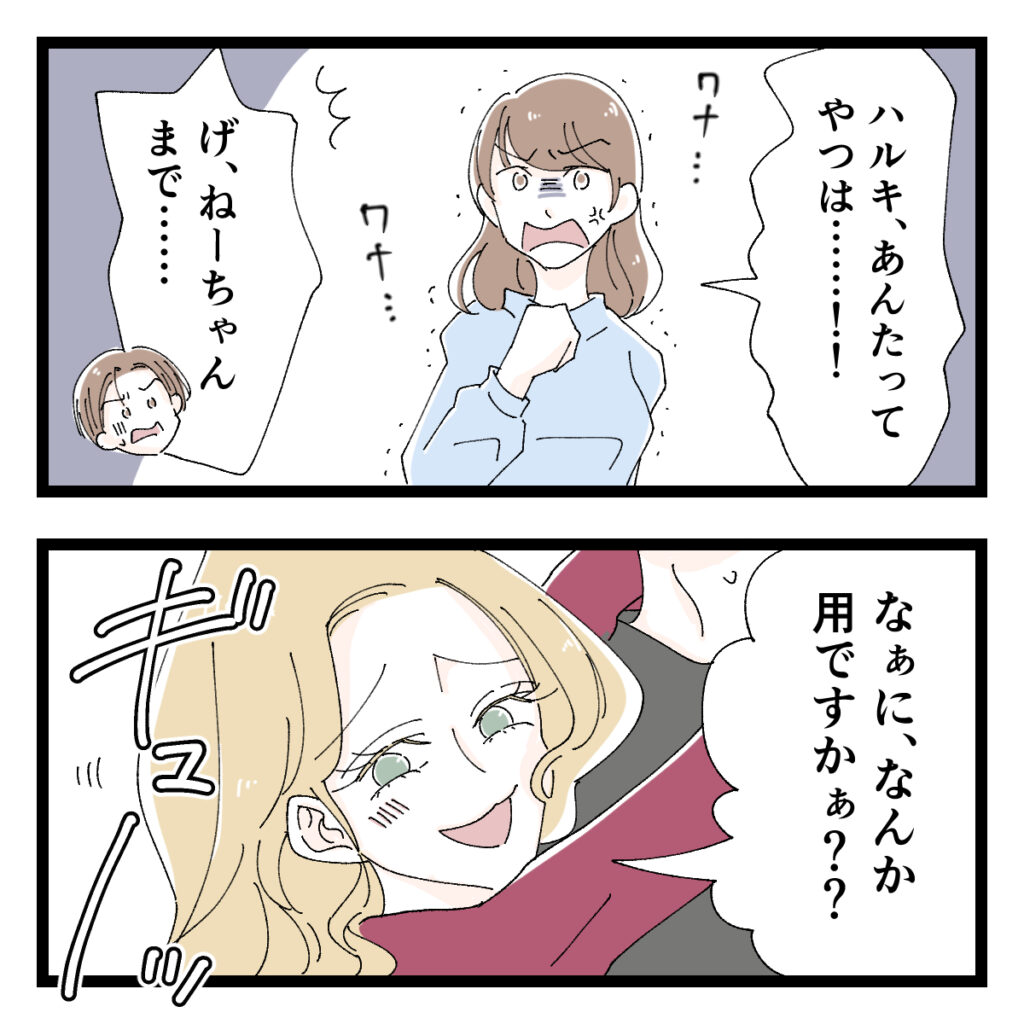 その様子をまじまじと見ていた私は、「ハルキ、あんたってやつは・・・・!!」とワナワナと震えていると、「げ、ねーちゃんまで・・」と顔面蒼白になるハルキ。すると、「なぁに、なんか用ですかぁ?」ハルキに抱き着いたままセリナが勝ち誇ったように言いました。
