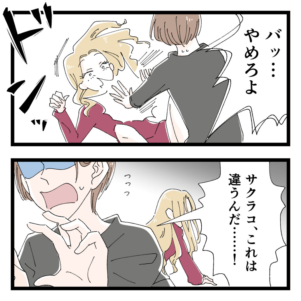 すると、「バッ・・やめろよ」とハルキがセリナを突き飛ばし、「サクラコ、これは違うんだ・・!」と乗り込んできたサクラコに必死に言い訳するのでした。