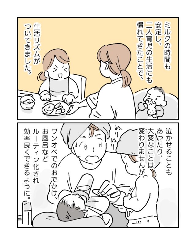 ミルクの時間も安定し、2人育児の生活にも慣れてきたことで、生活リズムがついてきました。