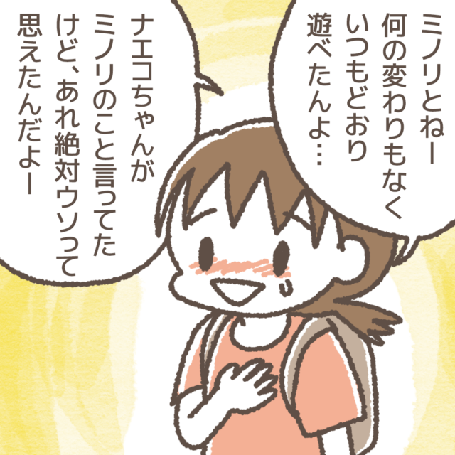 「ミノリとねー、何の変わりもなく、いつも通り遊べたんよ・・。ナエコちゃんがミノリのこと言ってたけど、あれ絶対ウソって思えたんだよー」