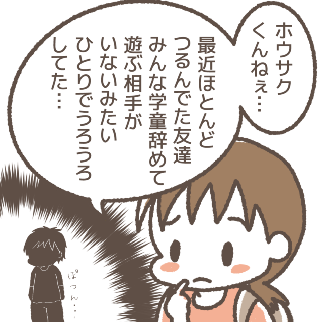 「ホウサクくんねぇ・・最近ほとんど、つるんでた友達がみんな学童辞めちゃって、遊ぶ相手がいないみたい。ひとりでうろうろしてた・・」