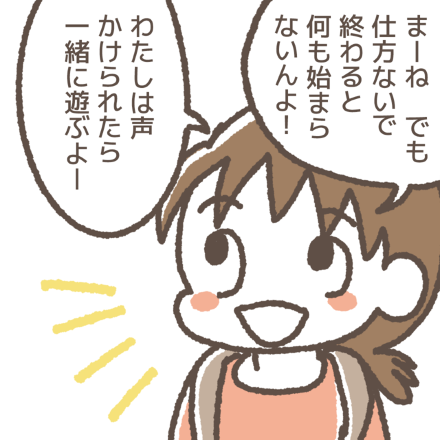 「まーね。でも、仕方ないで終わると何も始まらないんよ!わたしは声かけられたら一緒に遊ぶよー」
