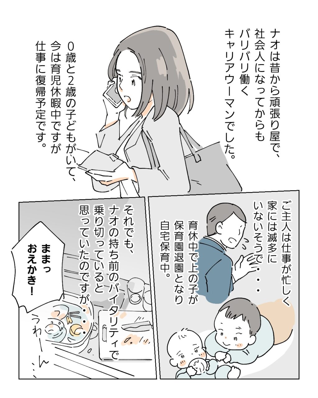 ナオは昔から頑張り屋で、社会人になってからもバリバリ働くキャリアウーマンでした。0歳と2歳の子どもがいて、今は育児休暇中ですが仕事に復帰予定です。育休中で上の子が保育園を退園となり、今は幼い2人を自宅保育中なのだそうですが、ご主人は仕事が忙しくほとんど家にいないそうでワンオペ育児です。それでも、ナオのことだから持ち前のバイタリティで乗り切っていると思っていました。でも・・実際は違ったのです。
