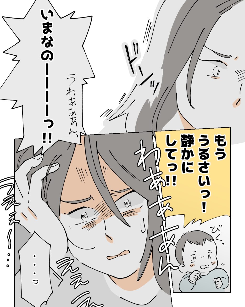 「いまなのーーーーっ!!」と泣き叫び全身で怒りを爆発させる上の子に、思わず「もう、うるさいっ!静かにしてっ!!」と怒鳴ってしまったナオさん。怒られた上の子は火が付いたように泣き出し、下の子も泣き止みません。子ども達の泣き声が響き渡る部屋の中で、ナオさんはもうどうすればよいのかわかりません。