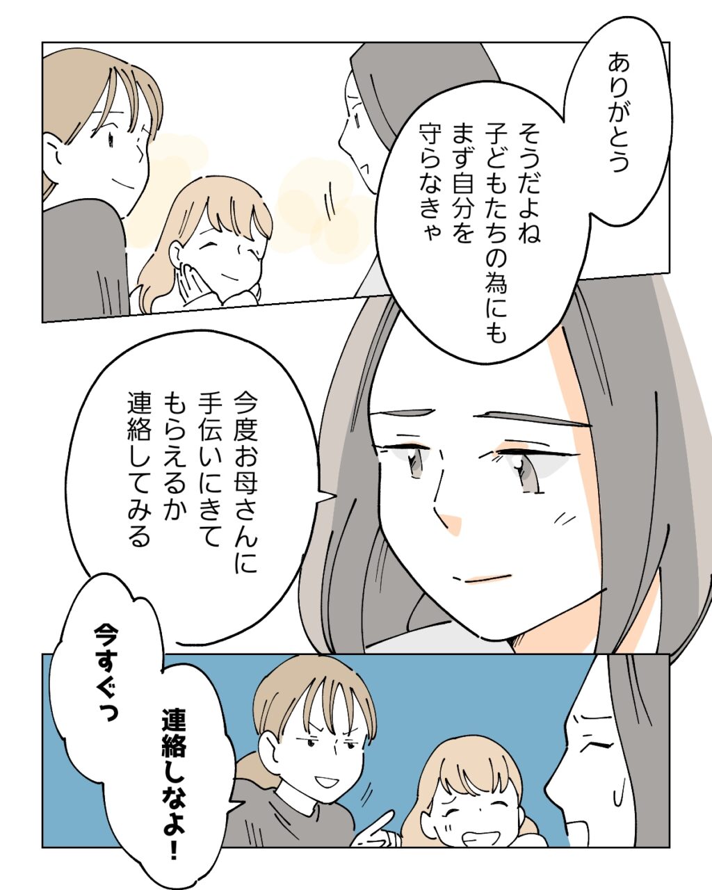 「ありがとう。そうだよね。子どもたちの為にもまず自分を守らなきゃ。今度お母さんに手伝いにきてもらえるか連絡してみる」とナオが言ったので、私は「連絡しなよ!今すぐっ」と促し、その場でお母さんにメッセージを送るように言いました。