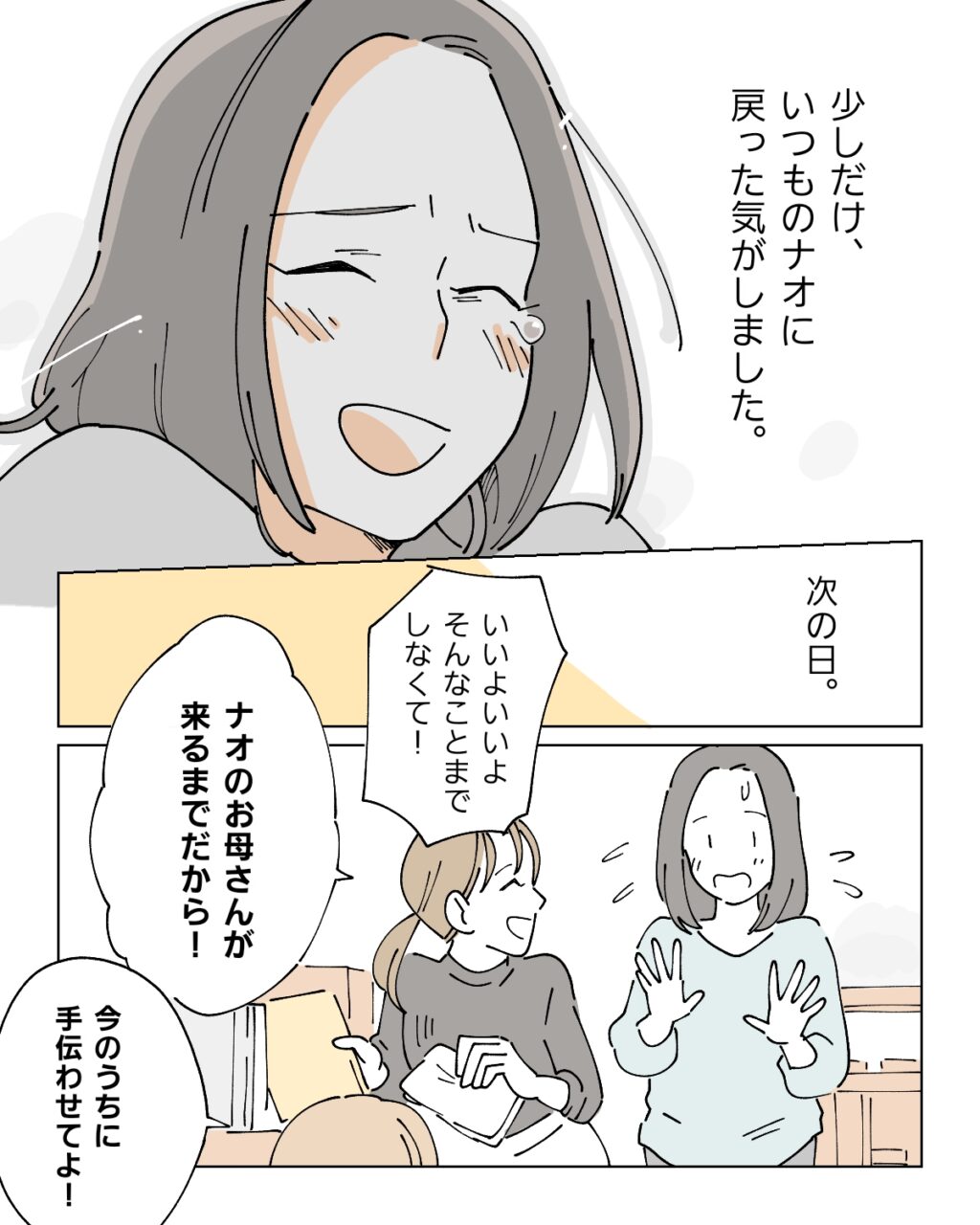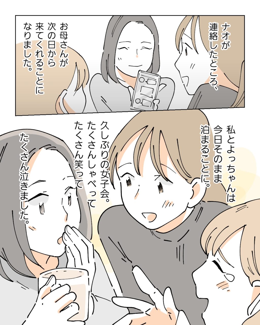 ナオが連絡をしたところ、お母さんはさっそく次の日から来てくれることになり、ナオと一緒に私とよっちゃんも喜びました。この日、私たちはそのままナオの家に泊まることにし、久々の女子会。たくさんしゃべって、たくさん笑って、たくさん泣きました。