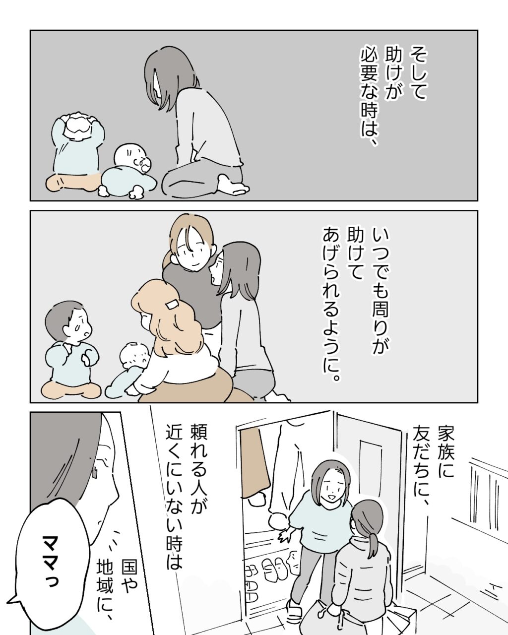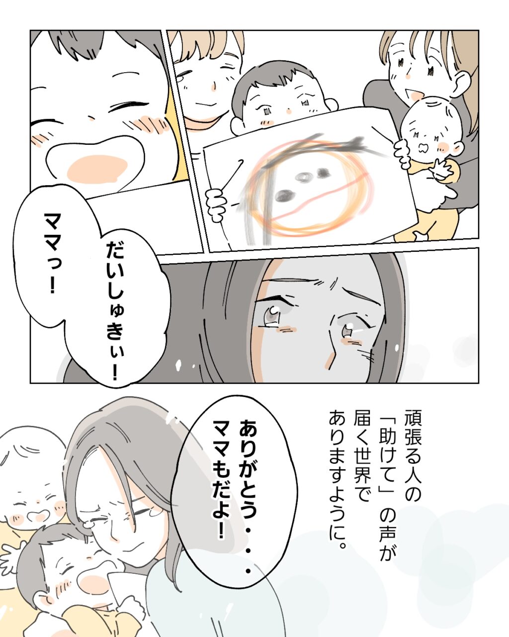 ナオのお母さんも到着したのでそろそろ帰ろうと思っていると、よっちゃんとお絵描きをしていた上の子が画用紙いっぱいに描いたママの絵を持ってきて「ママっ!だいしゅきぃ!」とナオに満面の笑みを向けました。「ありがとう・・ママもだよ!」と涙ぐみながら子どもを抱きしめるナオ。大丈夫。ナオの愛情は子ども達にしっかり伝わってる。一人で完璧にできなくても母親失格だなんて思わなくていい。今回はナオだったけれど、次は自分が壁にぶつかるかもしれない。その時は、一人で頑張りすぎず勇気を出して周りに「助けて」と声をあげようと思います。みんなが声をあげやすく、手を差し伸べやすい世界になりますように。