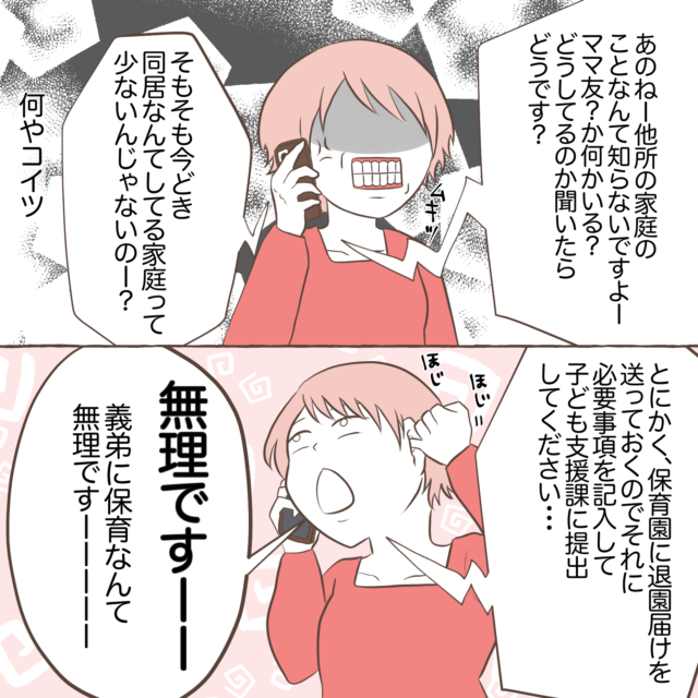 ニートになった義弟たいくんとの同居が始まってから2ヶ月後、市役所の子育て支援課から電話がかかってきました。突然の連絡に「私何かやらかした?」とドキドキしながら話を聞くと、なんとたいくんが同居していることで『家庭で保育できる人がいる』とみなされ、わたすさんの娘の姫ちゃんが保育園を退園になると言うのです・・・!