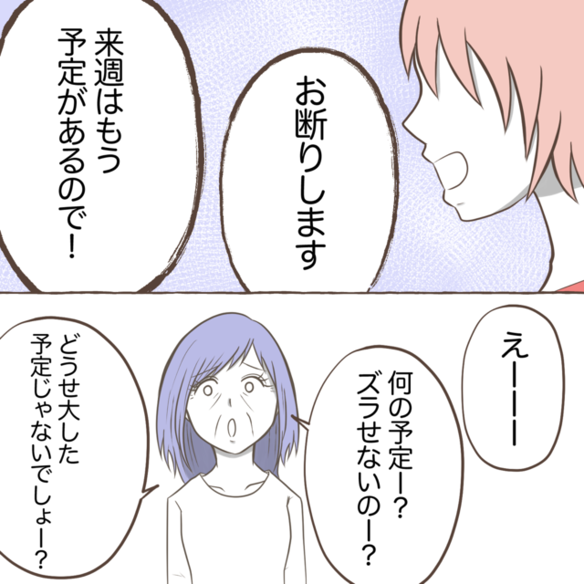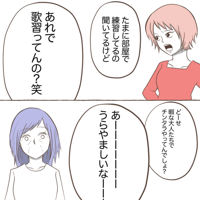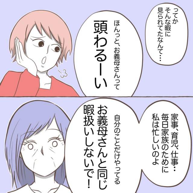 わたすさんにゴミの片付けをさせておきながら、さらに新たなゴミを出そうとする義母を見て「マジで持って来やがった!!」と驚くわたすさん、「お歌の発表会でネイルがボロボロじゃダメでしょ?よかったらみにきてー」と悪びれずに言う姿を見て「ブチッ!」・・わたすさんの中で何かがキレたのでした・・。