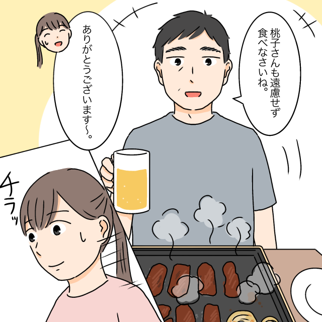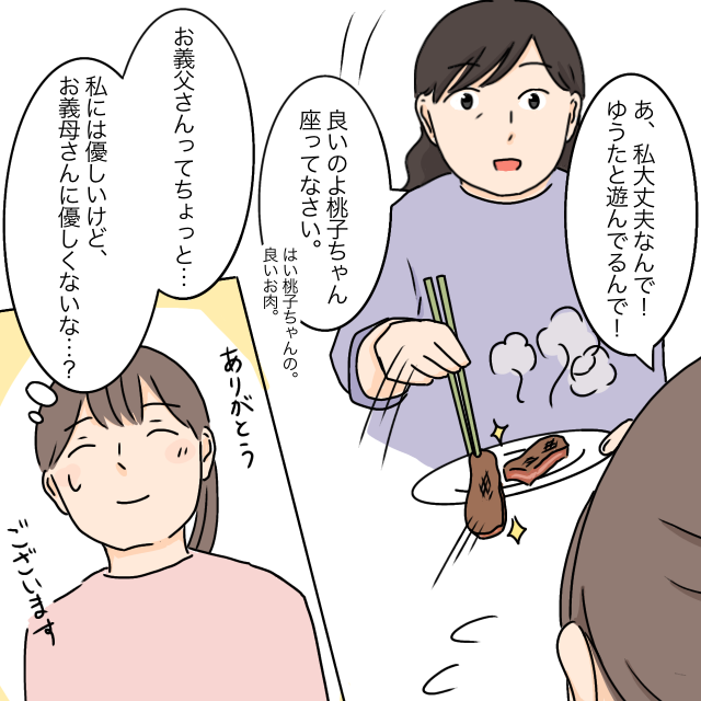 義母に視線を向けると、忙しなくお肉を焼いています。さすがにこの状態でゆうたを任せるのは申し訳ないと思った私は「大丈夫です」と断りました。けれど義母は、「良いのよ桃子ちゃん、座ってなさい」そう言ってそっと良いお肉を差し出してくれます。義父は私には優しいのに、義母にはそうでもないな・・・そんなことをつい考えてしまったのでした。