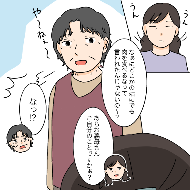 義母は、何も言わずにうんうんと頷きます。おそらく「いいお肉を焼くまで、もう少し待っててね」という合図なのでしょう。すると、なかなか箸をつけない私の様子を見た義祖母が、「なぁに、どこかの姑にでも肉を食べるなって言われたんじゃないの~?」と義母に向かって嫌味を放ちました。それに義母もすぐさま、「あらお義母さん、ご自分のことですかぁ?」と応戦します。
