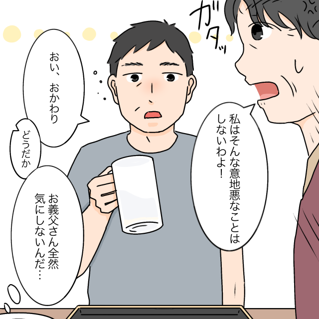売り言葉に買い言葉。義祖母はガタッと席を立ち「私はそんな意地悪なことはしないわよ!」と声を荒らげました。・・・ああ、また喧嘩が始まる。そう思った瞬間、「おい、おかわり」義父の一言が、2人の言い争いを遮りました。義父は、2人がどれだけ喧嘩していようと態度を変えることはありません。ここまでくると慣れっこなのでしょうか。