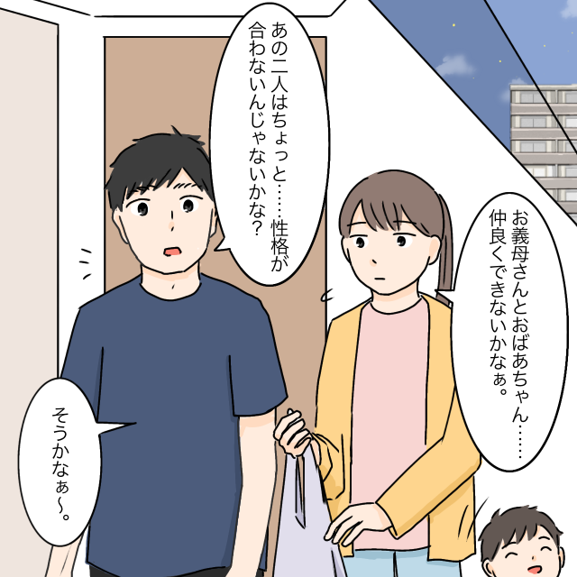 義母と義祖母のことを話しても、夫太郎は2人は性格が合わないのではないかと言いながらも、もう慣れてしまっているのか、それほど気にしていない様子です。