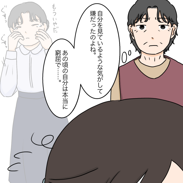 義祖母は義母の姿をじっと見つめながら、腑に落ちたような表情をしました。「自分を見ているような気がして嫌だったのね」今、義父に好き放題言われている義母の姿は、かつて姑にいびられていた頃の自分そのもの。あの頃は息が詰まるほど窮屈で、毎日「もう嫌だ」と泣いていたっけ・・・そんなことを心の中で思っていたようでした。