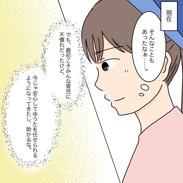 でも、最初こそみんな育児に不慣れだったけど、今じゃ安心してゆうたを任せられるようになってきたし助かるな」と心の中で呟きました。