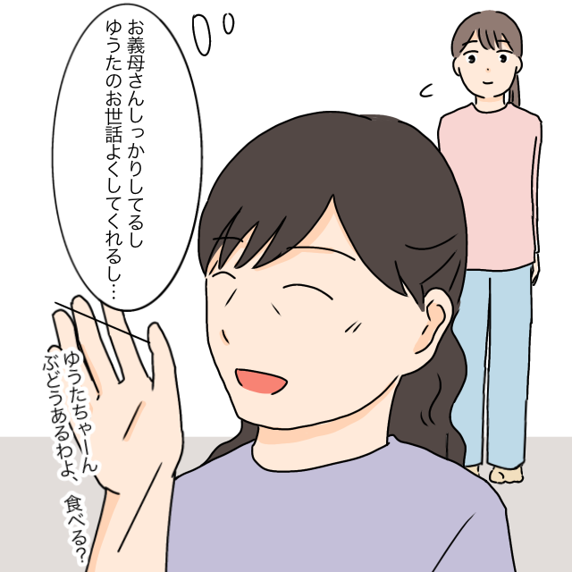 「お義母さん、しっかりしてるし、ゆうたのお世話よくしてくれるし・・」そう思いながら義母を見つめていると、「ゆうたちゃーん、ぶどうあるわよ、食べる?」とゆうたに話しかける義母。
