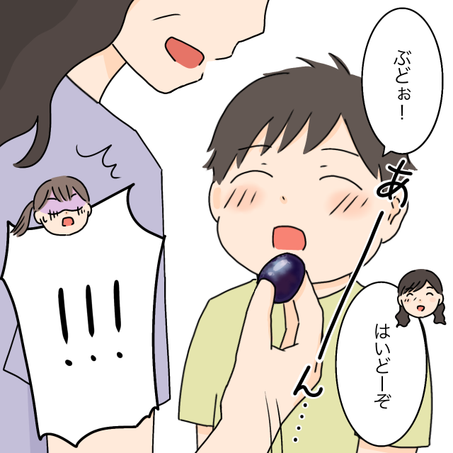 義母のところにやって来たゆうたに「はいどーぞ」と義母がぶどうを1粒差し出すと、「ぶどぉ!」とゆうたも大きい口を開けて・・「!!!」それを見ていた私はビックリ!