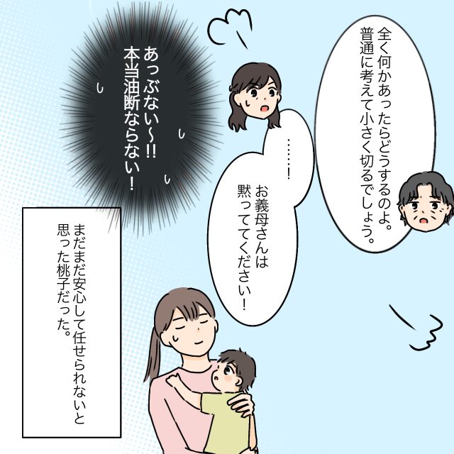 「全く。何かあったらどうするのよ。普通に考えて小さく切るでしょう」呆れながら言う義祖母に、「・・!お義母さんは黙っててください!」と怒り出す義母。私は「あっぶない~!!本当油断ならない!」と心の中で呟きながら、まだまだ安心して任せられないと思ったのでした。