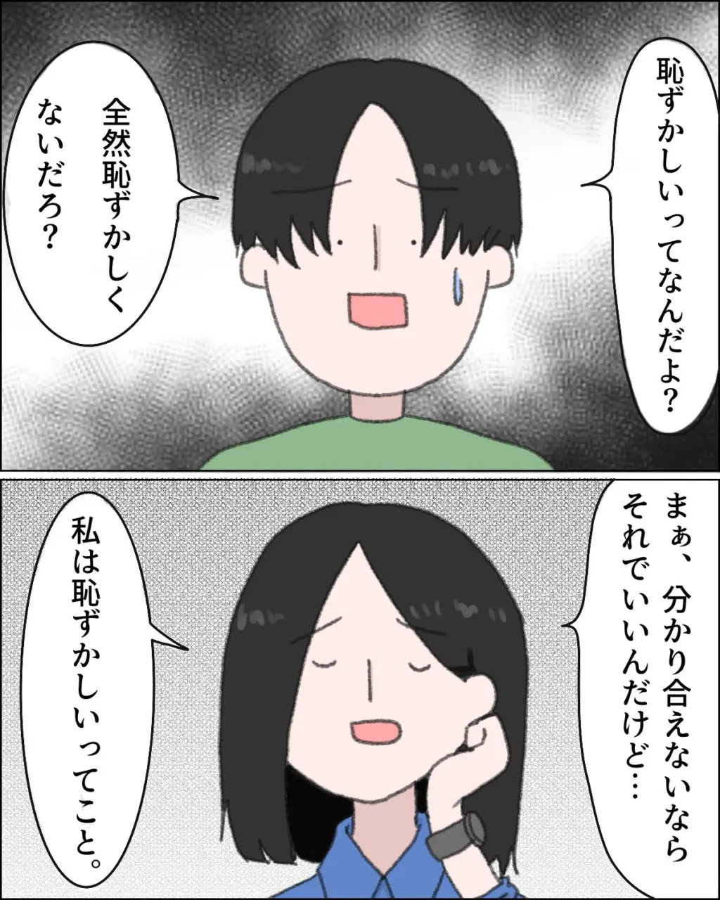マリさんの話を聞いても「恥ずかしいってなんだよ?全然恥ずかしくないだろ?」と全く理解できないといった様子のヒロユキさんに、「まぁ、分かり合えないならそれでいいんだけど・・。私は恥ずかしいってこと」とマリさんは冷めた口調で諦めたように言いました。