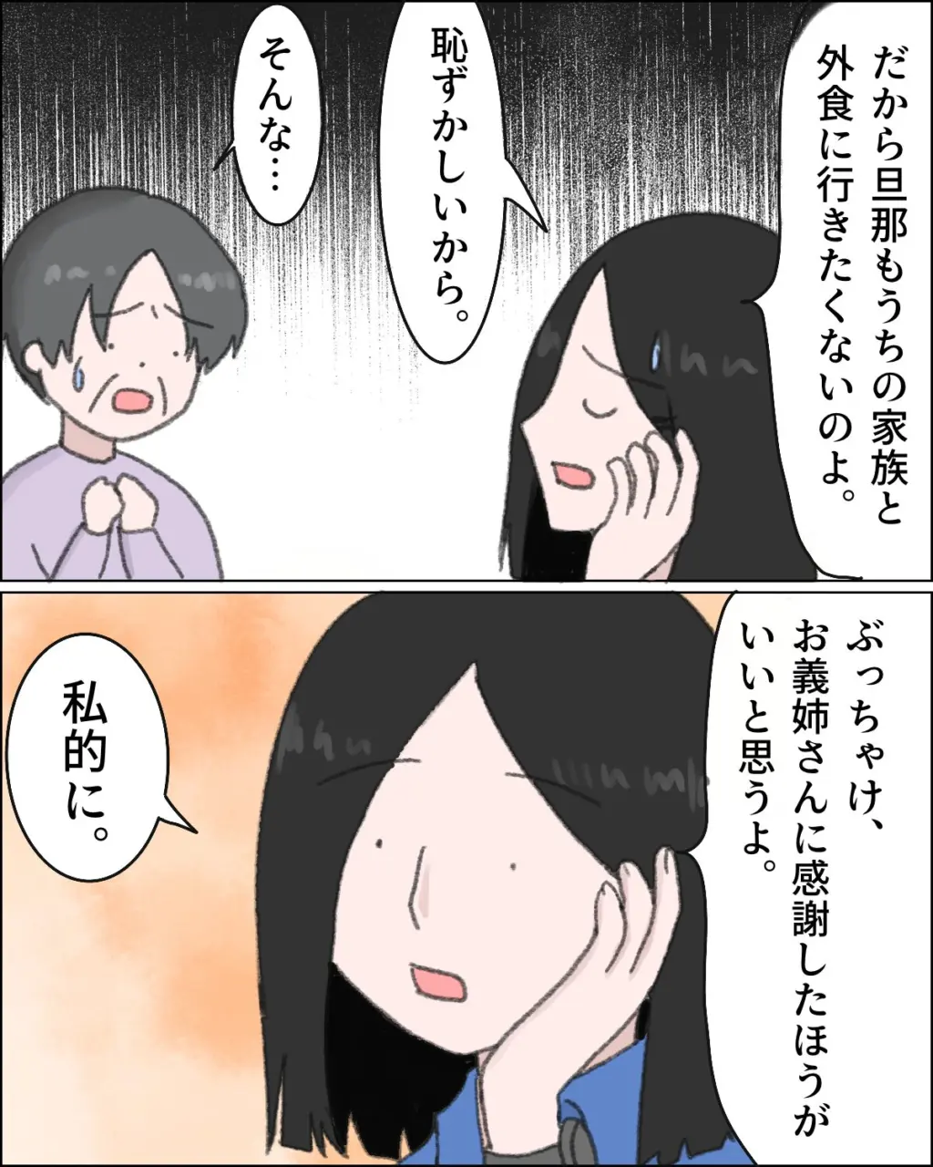「だから旦那もうちの家族と外食に行きたくないのよ。恥ずかしいから」と、これまで敢えて言わなかったことを打ち明けたマリさん。「そんな・・」と困惑するお母さんに「ぶっちゃけ、お義姉さんに感謝したほうがいいと思うよ。私的に」と言い、