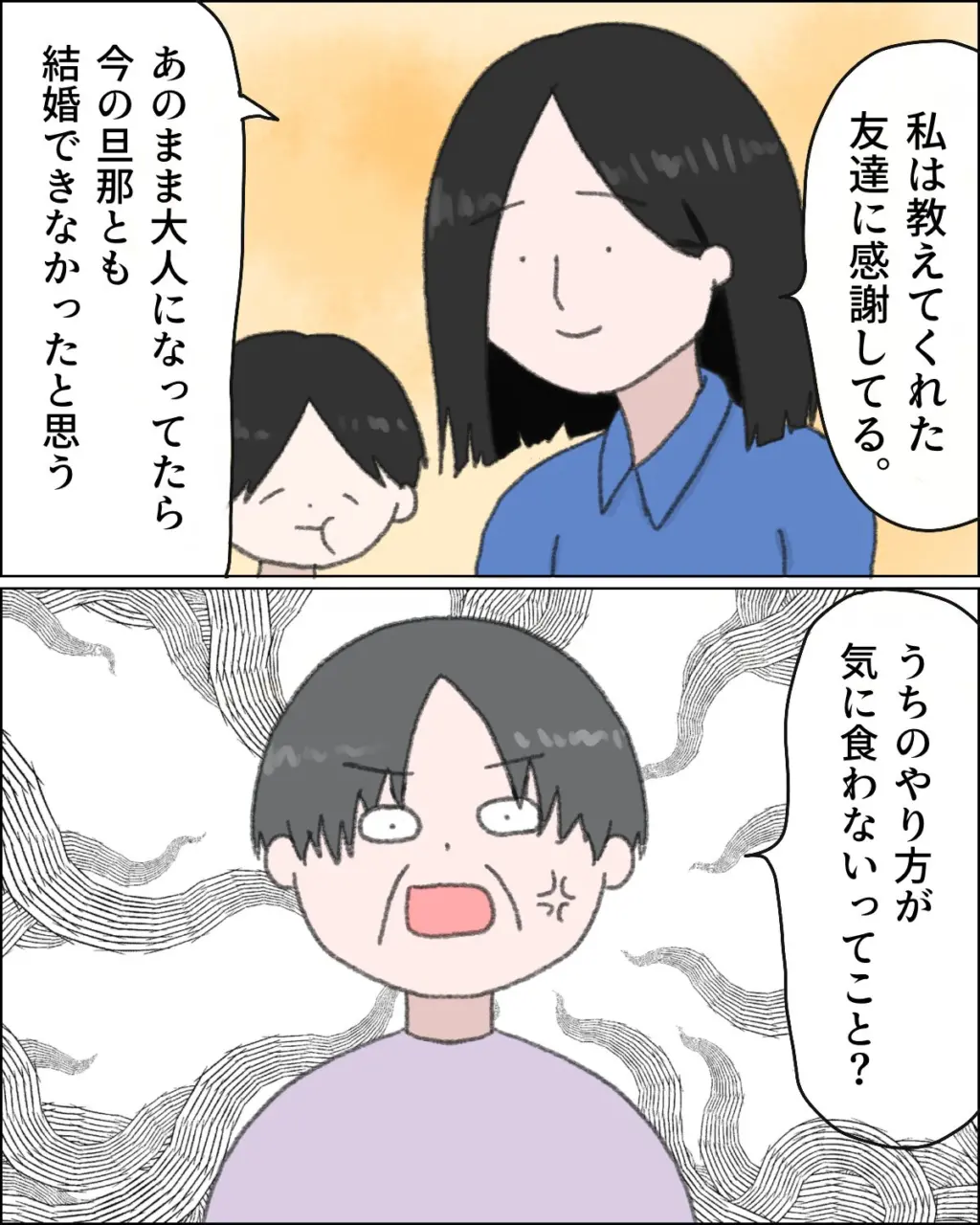 「私は教えてくれた友達に感謝してる。あのまま大人になってたら今の旦那とも結婚できなかったと思う」と高校時代の友達に感謝するマリさんを見て「うちのやり方が気に食わないってこと?」とお母さんは怒り出しました。
