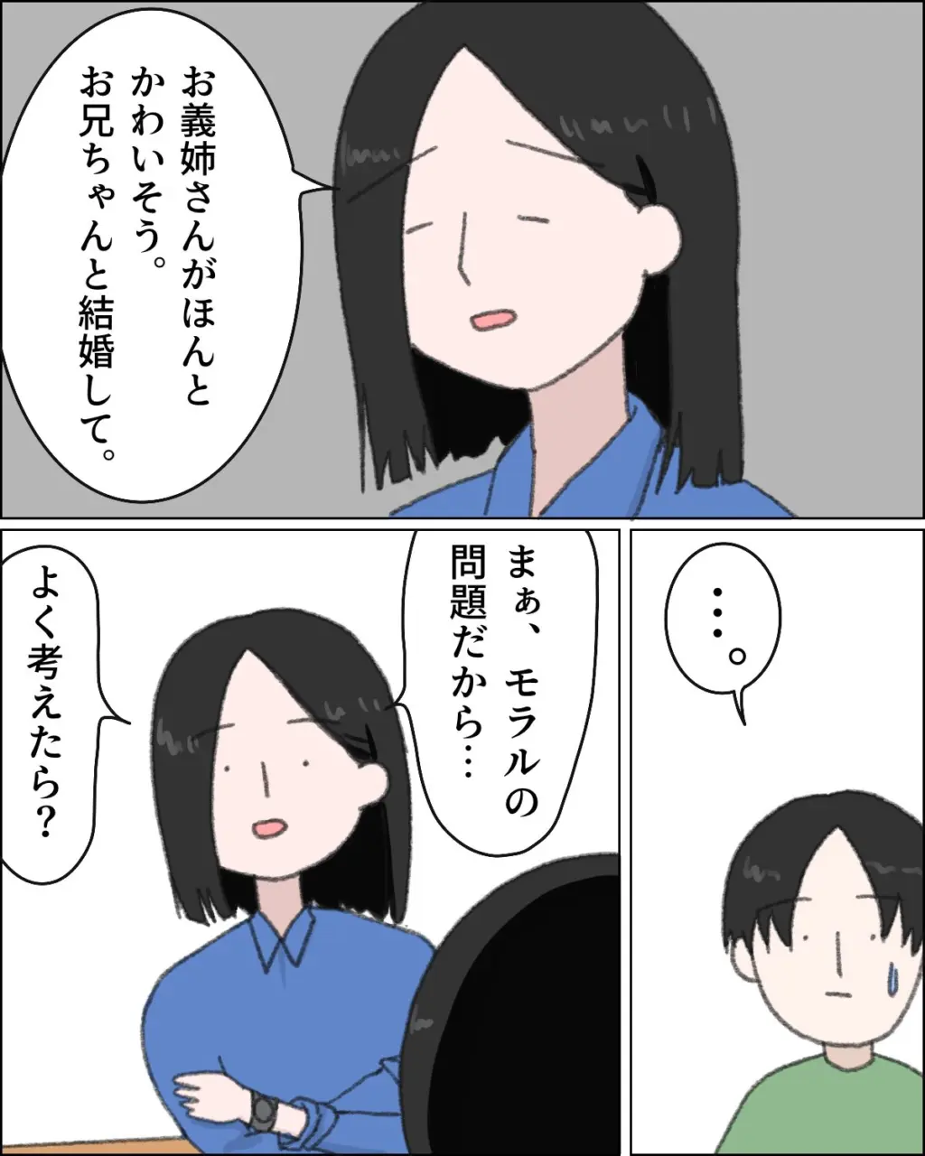 「お義姉さんがほんとかわいそう。お兄ちゃんと結婚して」とアキナさんに深く同情しました。無言になったヒロユキさんに、マリさんは「まぁ、モラルの問題だから・・よく考えたら?」とアドバイスしました。
