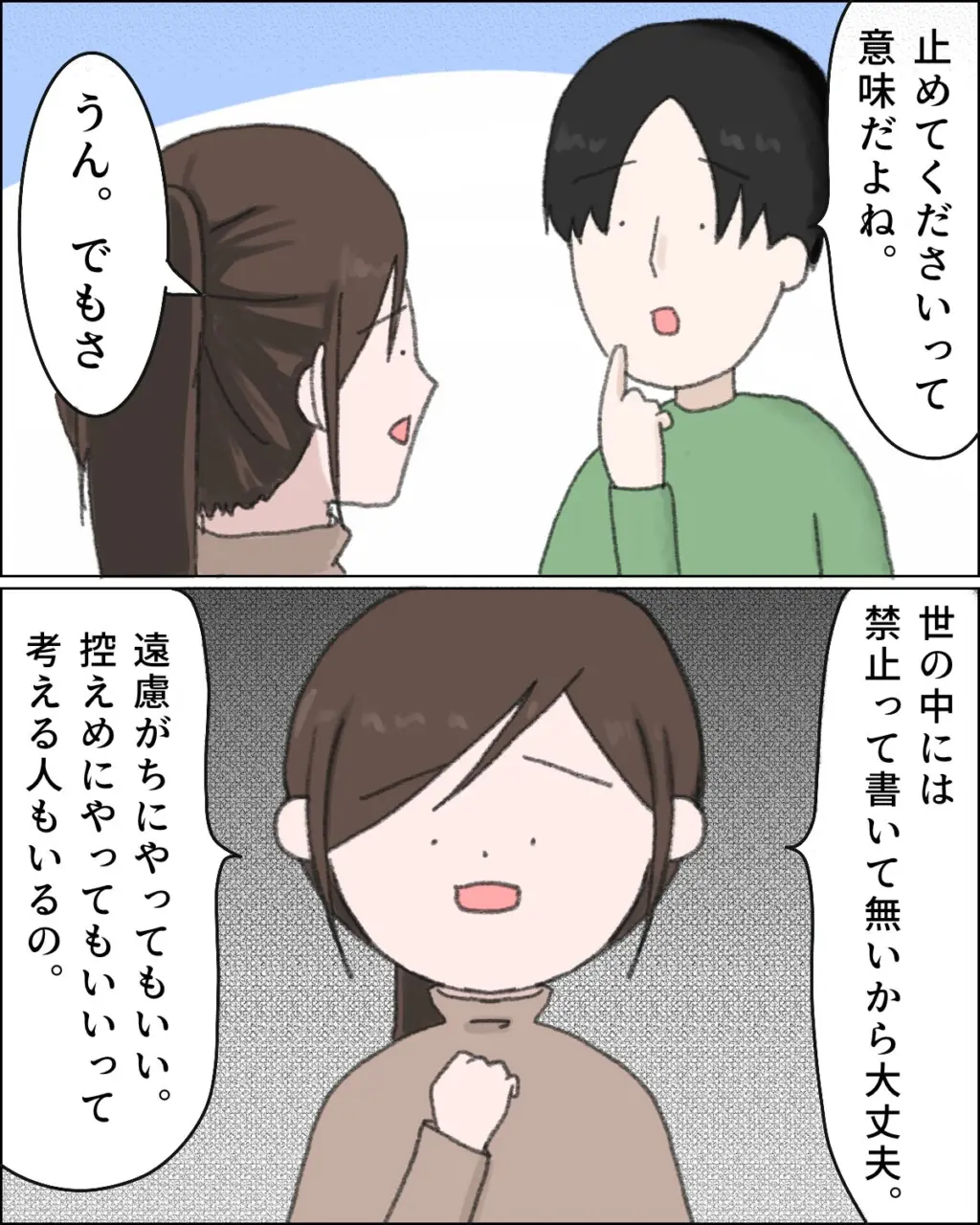 アキナさんの問いに、「止めてくださいって意味だよね」と当然といった様子で答えたヒロユキさんに、アキナさんは「うん。でもさ、世の中には禁止って書いてないから大丈夫。遠慮がちにやってもいい。控えめにやってもいいって考える人もいるの」と説明を始めました。