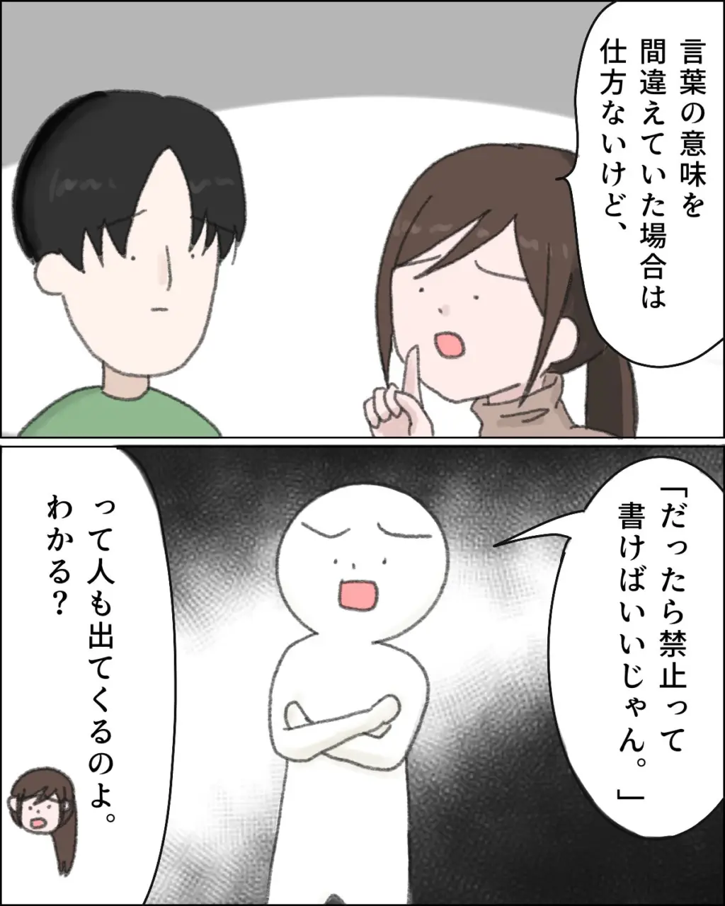 「言葉の意味を間違えていた場合は仕方ないけど、『だったら禁止って書けばいいじゃん」って人も出てくるのよ。わかる?」と例え話をするアキナさん。