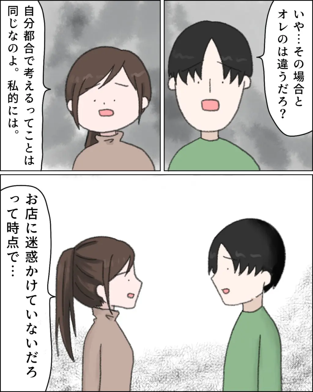 「いや・・その場合とオレのは違うだろ?」とヒロユキさんはピンときていませんが、「自分都合で考えるってことは同じなのよ。私的には。お店に迷惑かけていないだろって時点で・・」と、その考え方が良くないとアキナさんは言います。