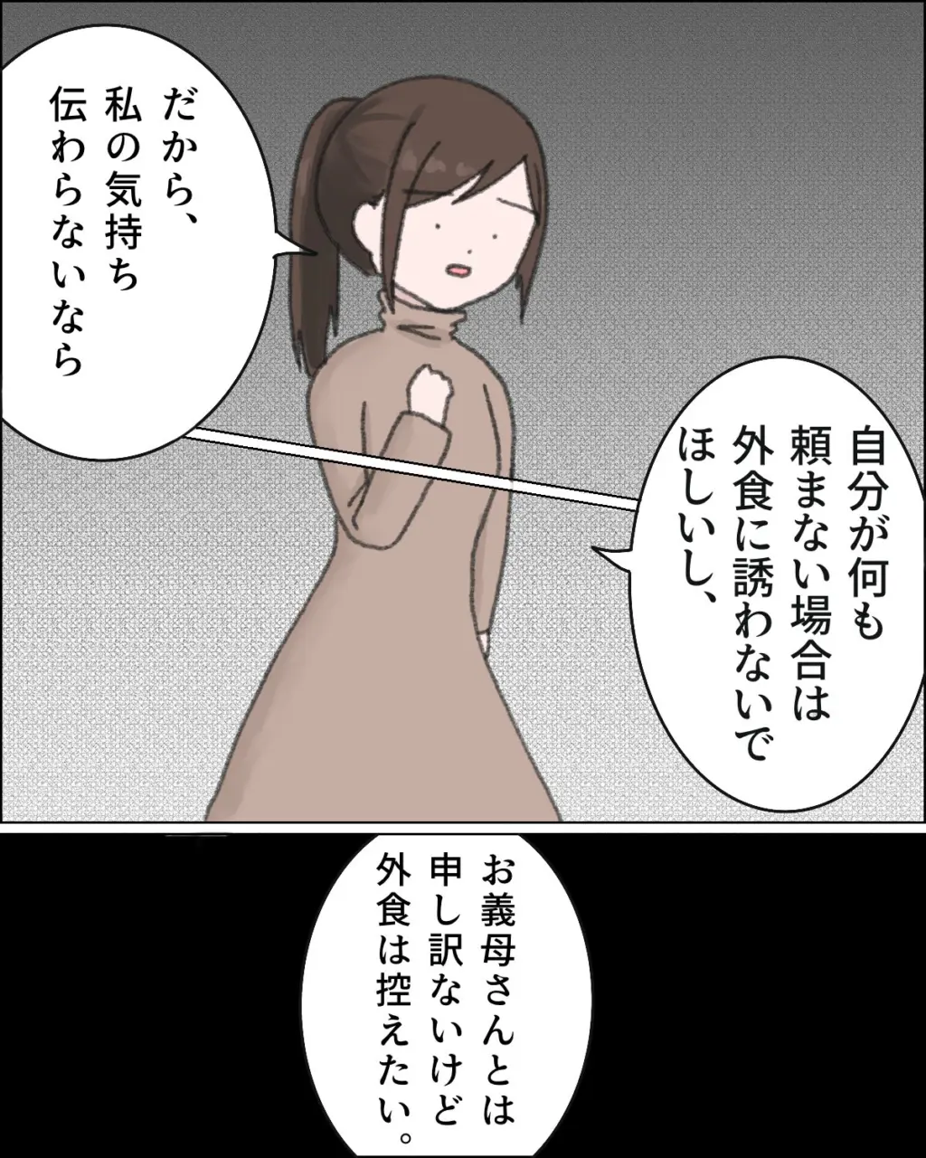 そして、「だから、私の気持ち伝わらないなら、自分が何も頼まない場合は外食に誘わないで欲しいし、お義母さんとは申し訳ないけど外食は控えたい」とはっきりと気持ちを伝えました。