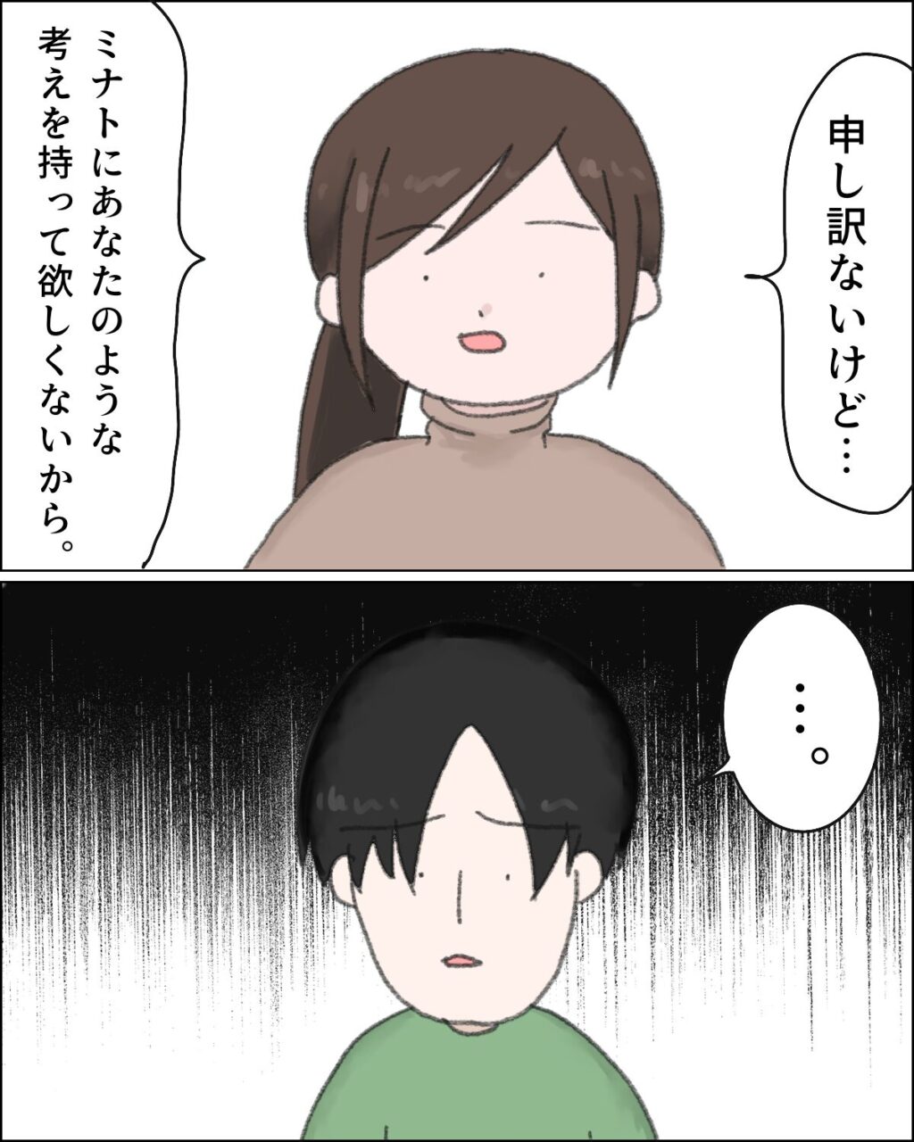 例を挙げながら、自分に都合よく解釈する思考が良くないとヒロユキさんに話すアキナさん。「ミナトにあなたのような考えを持って欲しくないから一緒に外食したくない」と厳しい言葉を突きつけられたヒロユキさんは言葉に詰まります。自分が信じてきた価値観を覆すのは簡単なことではないですよね。でも、アキナさんがここまで言うということはそれほどのことなのだと理解して欲しいです。