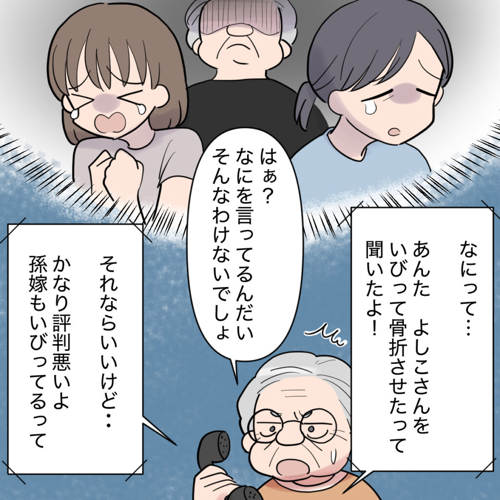 田中さんは「なにって・・・あんた、よしこさんをいびって骨折させたって聞いたよ!」と近所の噂を義祖母に伝えました。義祖母は寝耳に水です。「はぁ?なにを言ってるんだいそんなわけないでしょ」とすぐに否定すると「それならいいけど・・・かなり評判悪いよ。孫嫁もいびってるって」と田中さんは忠告しました。