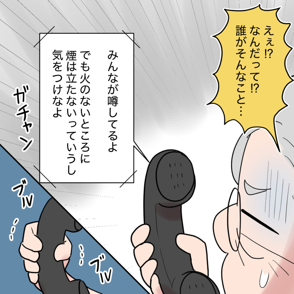 それを聞いて義祖母が焦ったのは言うまでもありません。「えぇ!?なんだって!?誰がそんなこと・・・」けれど、噂というのはそういうもの。「みんなが噂してる」と言われてしまいました。「でも日のないところに煙は立たないっていうし、気をつけなよ」そう言って田中さんは電話を切りました。
