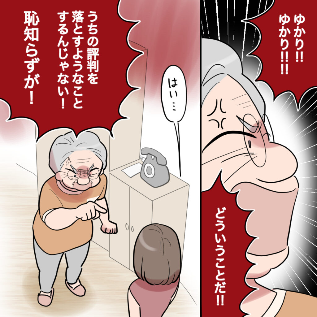 当然のことながら義祖母は怒り心頭です。「ゆかり!!ゆかり!!どういうことだ」とものすごい剣幕で呼びつけられ「うちの評判を落とすようなことするんじゃない!恥知らずが!」と怒鳴られた瞬間、私は外に飛び出しました。